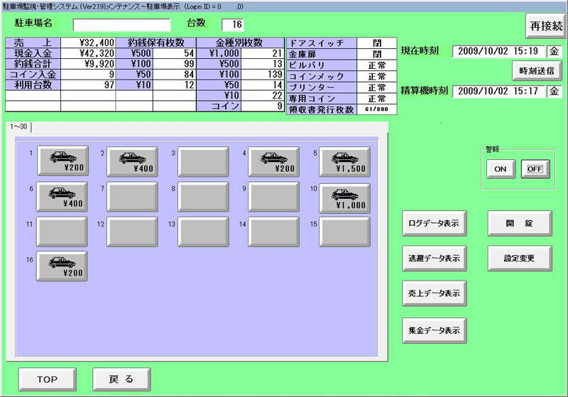 車室毎の売上管理画面:現在の売上がタイムリーに把握できます。一例では、1番の駐車スペースに現在200円の課金状態となっている駐車車両がいる事が確認できます。その他の車室も同様です。