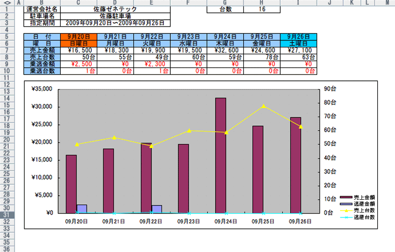週報管理画面:一週間の稼働の様子を、視認性が高いグラフ表示で確認することができます。売上グラフの形状の差から、地域の特性など、対策すべき点を読み取ることが可能です。当画像の木曜日の例では、台数の割に売上金額が他の曜日と比べて高いことが読み取れます。